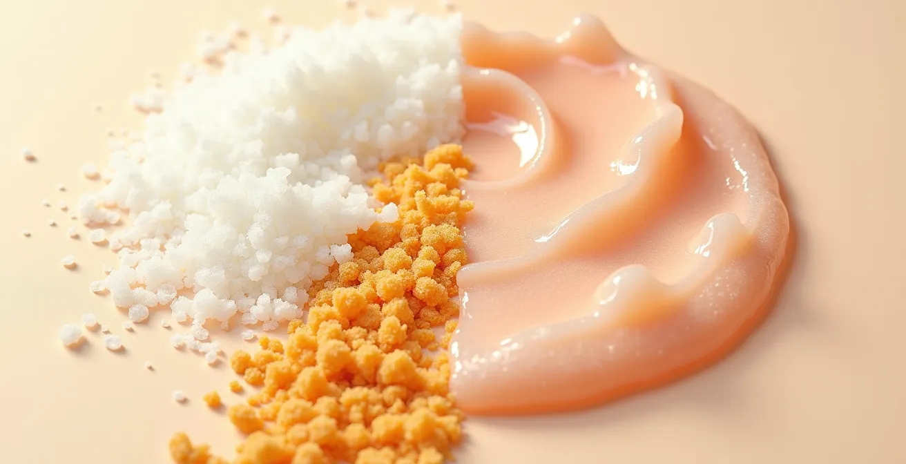 Les gommages à grains, souvent perçus comme une solution « naturelle » et efficace, sont en réalité une source majeure de stress pour une peau sensible. Le problème ne réside pas dans l’action mécanique elle-même, mais dans la nature des particules exfoliantes. Les grains issus de noyaux d’abricots, de sucre ou de sel possèdent des arêtes vives et irrégulières. À l’échelle microscopique, leur passage sur l’épiderme s’apparente à un ponçage agressif. Ils ne se contentent pas d’éliminer les cellules mortes ; ils créent d’innombrables micro-lésions sur la barrière cutanée.